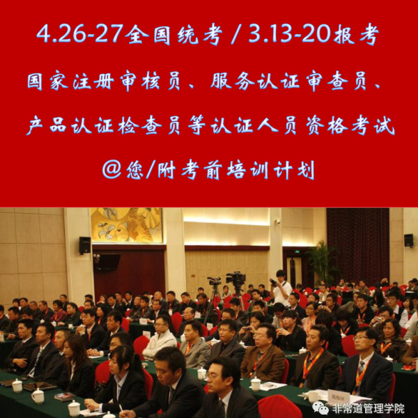 一次正确的选择,胜过千万努力!非常道管理学院集15年以上在国家注册审核员等认证人员职业资格考试培训方面的扎实功底与丰富资源,我们坚持“确保学员各项培训收益,确保资深讲师授课,确保统考合格率在95%以上,免费推荐机构挂靠注册,新老学员长期合作共赢”的培训增值服务理念与特点,在业内深受好评。为感谢各新老学员朋友们及合作机构的长期的信赖与支持,在2026年1-6月,特推出QMS、EMS、OHSMS、FSMS、50430、EnMS、ISMS、ITSMS等体系认证审核员、服务认证审查员、产品认证检查员考前培训辅导班,以网络培训为主+广州北京上海深圳等地面授班相结合的培训模式。面授班具体时间待定;全国网络班,报名缴费后即可随时随地学习,直播平台(可回放)均为资深金牌讲师主讲;网络课程包括:教材+网课+考试题库+答疑+带CCAA标志培训证书;三年内免费复训。新老学员推荐及通过网站、公众号、微信群、QQ群渠道报名前300名的限领3张优惠券抵扣培训费,在原价基础上可享受特惠价。具体优惠政策,欢迎来电或微信咨询。报名咨询热线:15817139618(手机微信同号),联系人:彭老师。